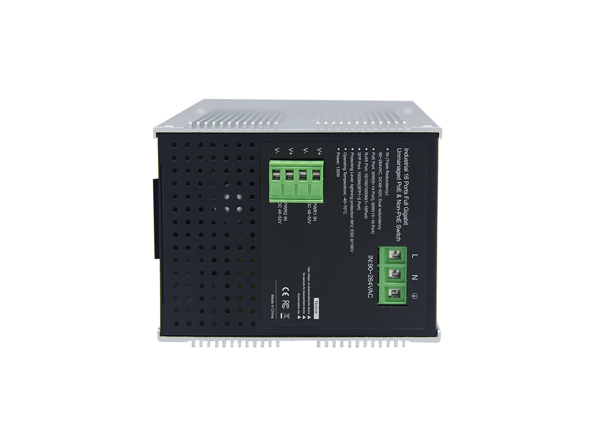 A switch kettős redundáns bemeneti tápellátással rendelkezik, amely 90-264V AC vagy DC48-52V között működik. Ez a kialakítás biztosítja a folyamatos működést és minimalizálja a leállások kockázatát.