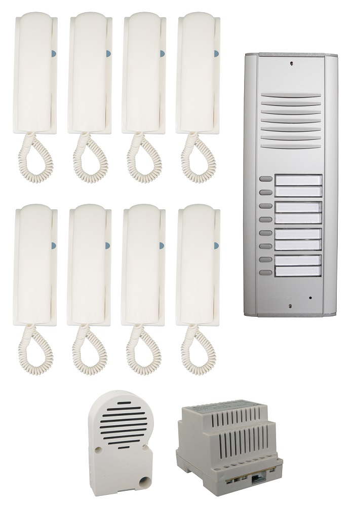 - 8 lakásos rendszer: A szett 8 különálló lakás számára biztosít kommunikációs lehetőséget, így ideális kisebb társasházak vagy irodák számára.