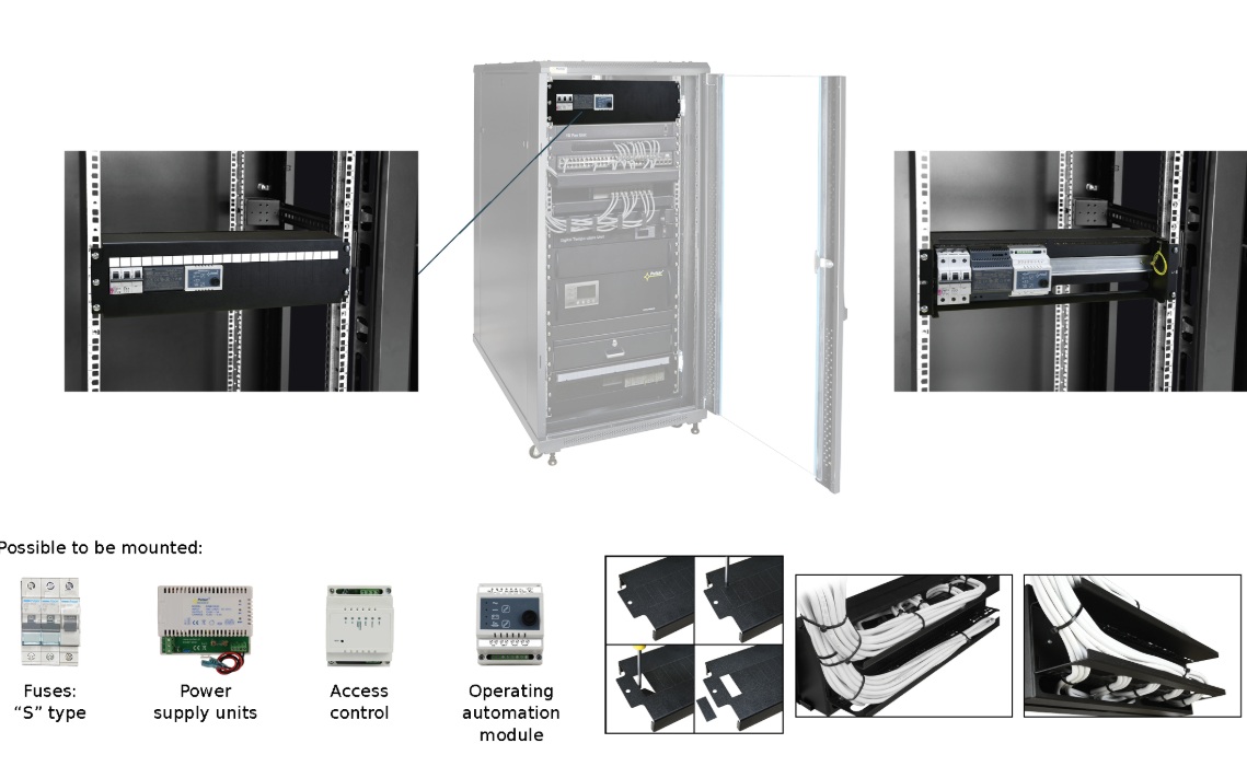 A panel kifejezetten feszültségelosztó rendszerek számára lett tervezve, ahol a DIN sínre szerelhető biztosítékok gyors és egyszerű telepítése, valamint karbantartása elsődleges szempont. A termék 19” RACK S típusú szekrényekbe illeszkedik, így kiválóan alkalmazható ipari, informatikai vagy távközlési környezetben is.