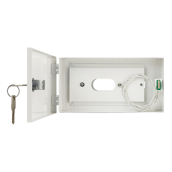 PULSAR kisméretű szabotázsvédett fém doboz, kezelők illetéktelen hozzáférés elleni mechanikus védelme, kompatibilis: Satel CA-4V KLED, CA-6 KLED, CA 10 KLED, CA-64 S, CA-64 SZ, SZW-02, kivehető szerelőlap, kinyitás elleni szabotázsvédelem, mechnanikus zár, 0.7 mm vastagságú acéllemez ház, külső méret: 215x115x40 mm, kezelő max. mérete: 158x105x30 mm, beltéri alkalmazás, fehér szín, működési hőmérséklet -10°C~+40°C