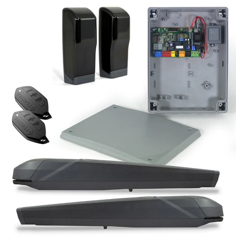 A PROTECO KIT-RHINO-XL-BASIC egy komplett, kétmotoros szárnyaskapu automatizálási szett, amelyet akár 5 méter hosszú és 450 kg tömegű kapuszárnyak mozgatására terveztek. A csomag tartalmazza a két darab RHINO XL teleszkópos motort, a Q80A vezérlőegységet, egy pár RF40 fotocellát, valamint két darab IKON távirányítót. A rendszer ideális választás lakossági, társasházi vagy ipari környezetbe, ahol fontos a megbízhatóság, a nagy teljesítmény és a hosszú élettartam. A teleszkópos kialakítás lehetővé teszi a széles nyitási szöget és a rugalmas telepítést, még mélyen ülő pillérek esetén is.