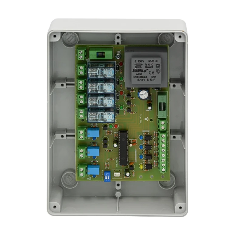 A vezérlő 4 bemenettel rendelkezik, amelyek lehetővé teszik a különböző érzékelők vagy kapcsolók csatlakoztatását. A 3 kimenet biztosítja a két lámpás rendszer precíz és szinkronizált működését, így garantálva a forgalom biztonságos és hatékony irányítását. A digitális vezérlésnek köszönhetően a rendszer gyorsan és pontosan reagál a bemeneti jelekre, minimalizálva a hibalehetőségeket.