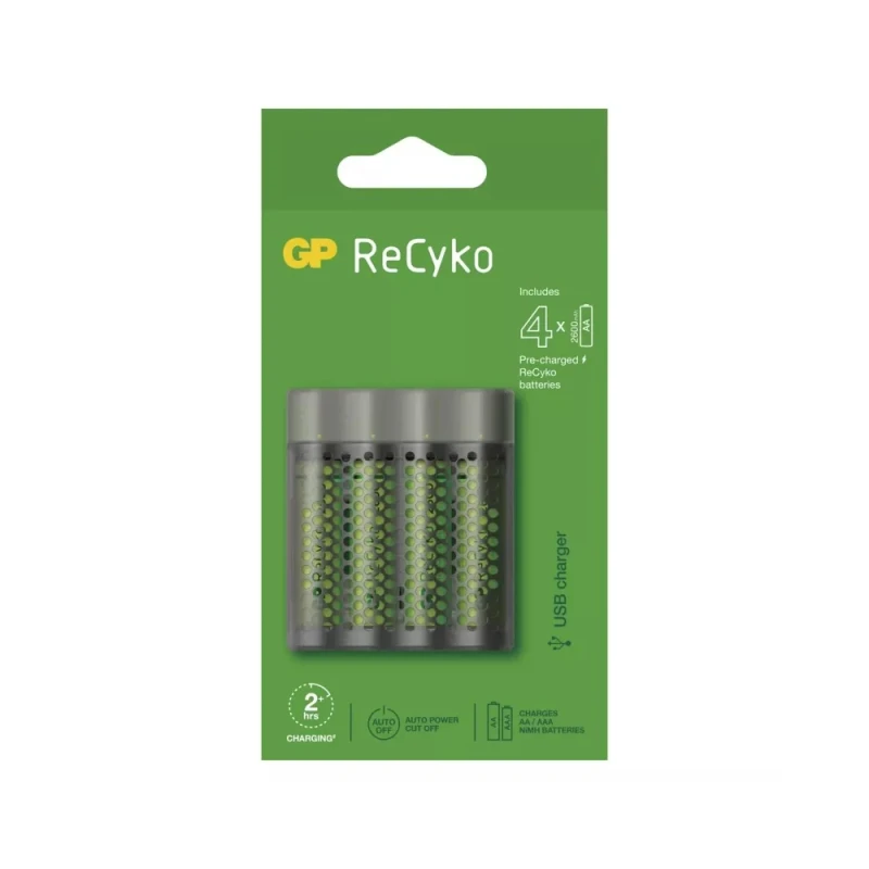 A GP ReCyko akkumulátorok és a töltő együttesen biztosítják a környezetbarát és fenntartható energiafelhasználást. A töltő minimalizálja a környezetterhelést azáltal, hogy óvja az akkumulátorok élettartamát. A GP ReCyko akkumulátorok gyártása során újrahasznosított anyagokat is felhasználnak, és a termék csomagolása is környezetbarát papírból készül.