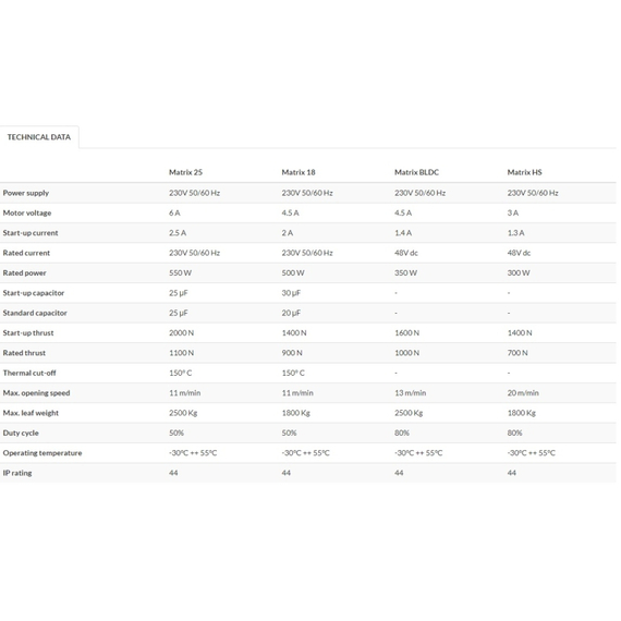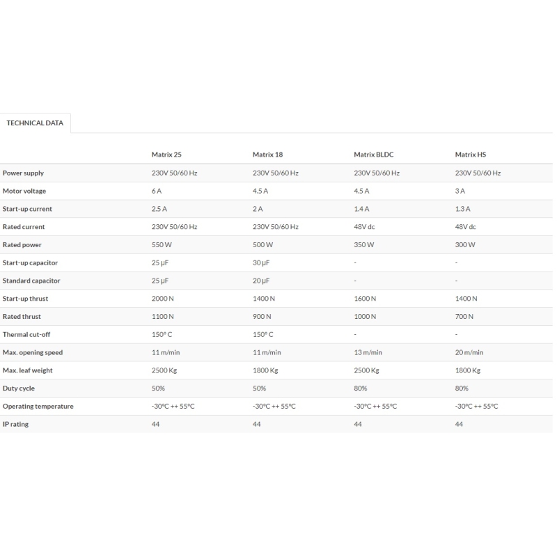 A PROTECO MATRIX25 egy professzionális, nagy teljesítményű tolókapu motor, amelyet kifejezetten ipari és nagy igénybevételű használatra terveztek. Ez a motor akár 2500 kg súlyú kapuk mozgatására is alkalmas, így ideális választás nehéz kapukhoz, például ipari létesítményekben, társasházaknál vagy nagyobb családi házaknál. A motor 50%-os üzemi ciklussal rendelkezik, ami azt jelenti, hogy a működési idő és a pihenőidő aránya egyenlő, így hosszú távon is megbízható teljesítményt nyújt.