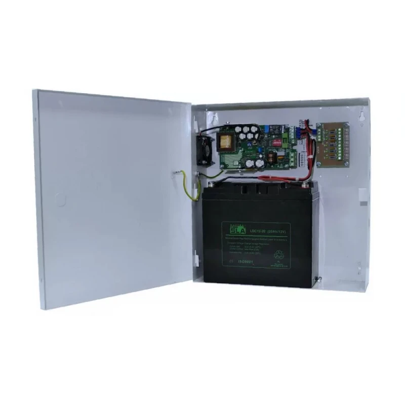 MAKRAI CCTV tápegység zárható fémdobozban 5 kimenettel + DVR, akkumulátor hellyel (12 V / 18 Ah), 230 V AC bemenet, 13.8 V DC kimenetek, kimenetenként max. 1A, visszajelző LED-ek, DVR tápegység: 12V/4A (ME.55-12/4 DC-DC), DIP SWC beállítási lehetőség, 40 perc szünetmentesítési idő, szünetmentesített módban a feszültség fix 13.8V, 2A töltőáram, hibakimenet kontaktus (max. 30Vdc - 100mA), I. érintésvédelmi osztály, IP20 védettség, működési hőmérséklet -10°C és +40°C között, méret 290x280x75+8mm