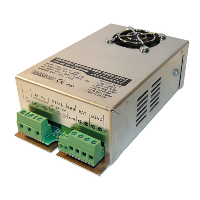MK-PSU10 Tápegység 230 VAC bemenet, 12–13,8 V DC szabályozható kimenet, 10 A, védelemmel, LED visszajelzéssel, akkumulátor töltő kimenettel