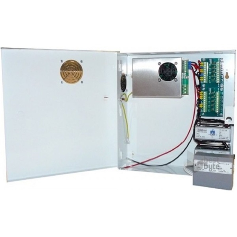 MAKRAI CCTV tápegység fémdobozban, bemeneti feszültség 230 VAC, kimeneti feszültség 10,5-13,8 VDC, 10 db kimenet, kimenetenkénti áramerősség 1 A, kimenő feszültség és áramerősség DVR számára 12 VDC, 4 A, akkumulátor töltő kimenet 2,5/5 A, szünetmentesített üzemidő kb. 1,5 óra, hálózati impulzus túlfeszültség, túlterhelés, rövidzárlat, túlmelegedés, túlfeszültség, mélykisülés, akku fordított polaritás elleni védelem, hibakimenet, működési hőmérséklet -10 °C…+ 40 °C, 290 x 280 x 75+8 mm