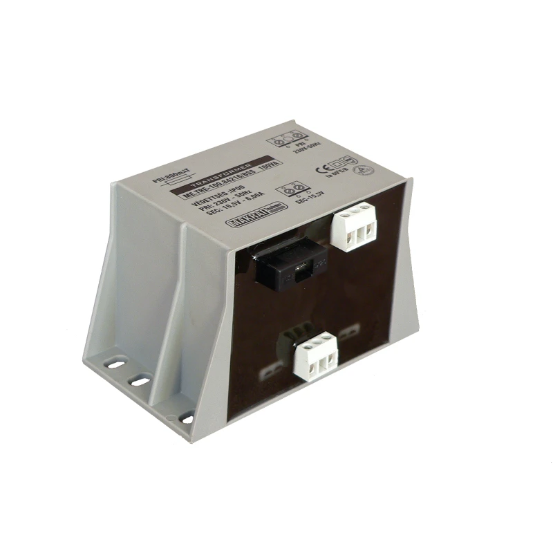 MAKRAI Transzformátor, osztott kamrás, műgyantával kiöntött, 230 / 15.5 Vac, szekunder áram 6.06 A, 100 VA, 800 mAT olvadóbiztosító, sorkapcsos csatlakozás max. (2.5 mm2), méret 120x75x78 mm