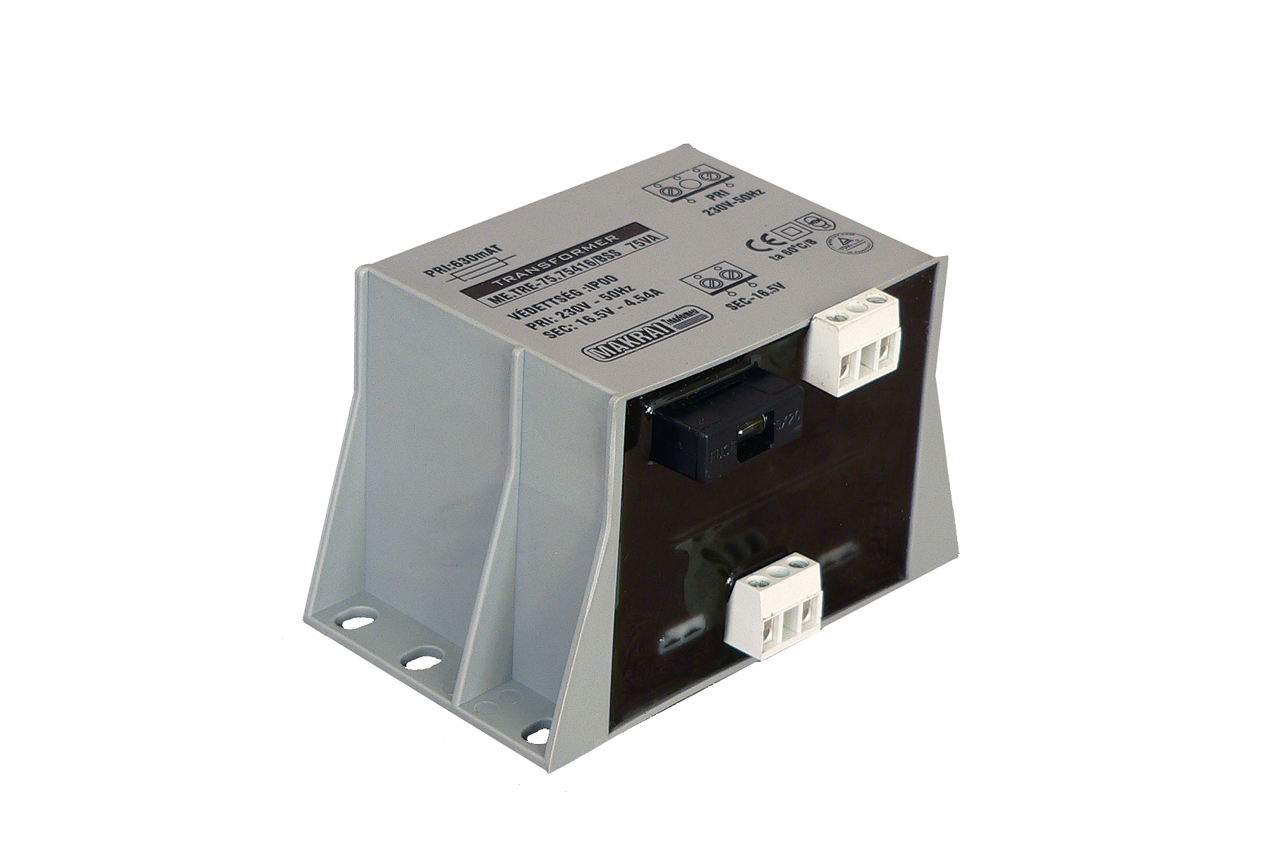MAKRAI Transzformátor, osztott kamrás, műgyantával kiöntött, 230 / 16.5 Vac, szekunder áram 4.54 A, 75 VA, 630 mAT olvadóbiztosító, sorkapcsos csatlakozás max. (2.5 mm2), méret 105x66x72.5 mm