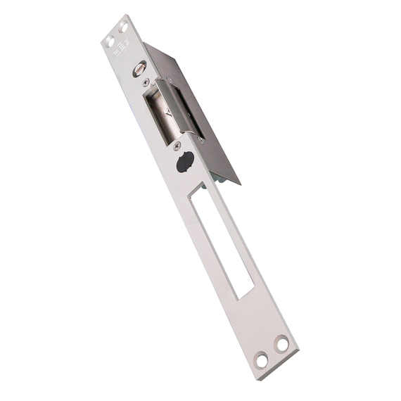 NUOVAFEB Elektromos zár ellenoldal, 8V/0,3A - 12V/0,5A impulzus, állítható homlokszélesség, memóriás, kiakasztható, hosszú, szakítóerő: 250kg, nyitást blokkoló erő: 24kg. - A hosszú homloklap bevéső - vagy portálzárak egyenes zárnyelvének fogadását teszi lehetővé.