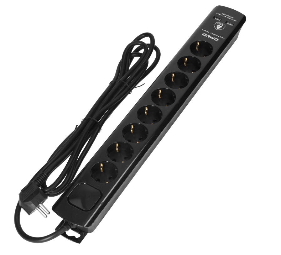 ORNO ORAE13244(GS)/B/3M túlfeszültség-védett elosztó, 8 aljzattal, 2x USB, 3 m