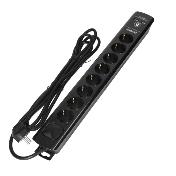Az ORNO ORAE13244(GS)/B/3M egy professzionális túlfeszültség-védelemmel ellátott elosztó, amely ideális megoldás irodai, műhely- vagy otthoni alkalmazásokhoz, ahol egyszerre több elektromos eszköz biztonságos és megbízható tápellátása szükséges. A 3 méter hosszú, 3x1,5 mm2 keresztmetszetű kábellel szerelt elosztó 8 darab 2P+E (Schuko) aljzattal rendelkezik, valamint két darab USB-A töltőporttal (5 V / 2,1 A), amelyek lehetővé teszik mobil eszközök közvetlen töltését. A beépített Type 3 túlfeszültség-védelem 375 J energiát képes elnyelni, így hatékony védelmet nyújt a hálózati zavarokkal és villámcsapásokkal szemben. A kétállású, megvilágított kapcsolóval az elosztó teljesen áramtalanítható.