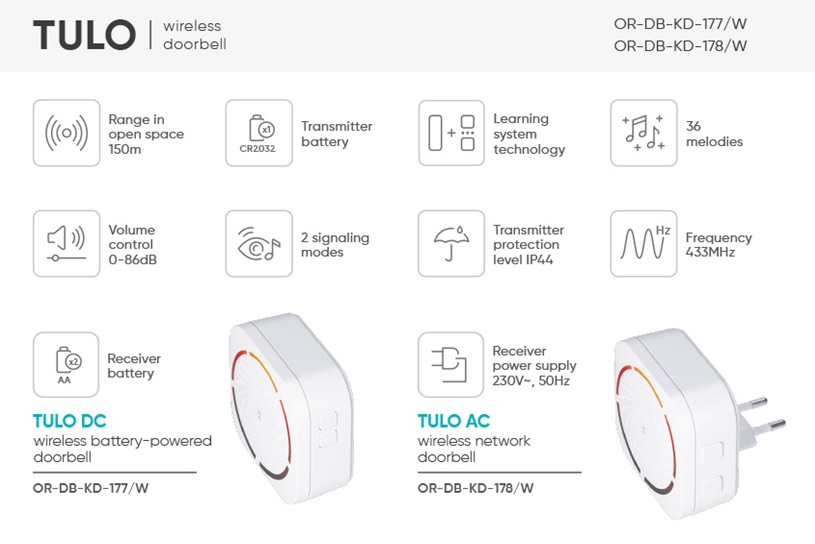 ORNO - ORDBKD-178/W TULO AC, vezeték nélküli, hálózati árammal működő ajtócsengő, tanuló rendszer, 36 hang, 150 m, fehér