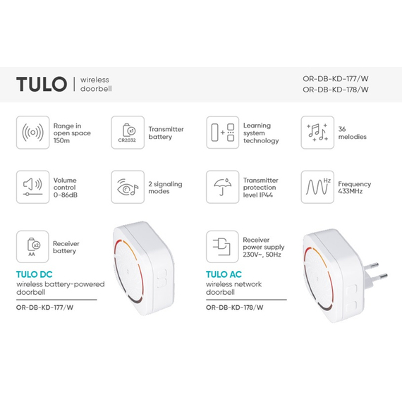 Az ORNO ORDBKD-177/W TULO DC vezeték nélküli ajtócsengő ideális választás azok számára, akik gyorsan és egyszerűen szeretnének megbízható jelzőrendszert telepíteni, kábelezés nélkül. A tanuló rendszer rugalmasságot, a választható hangok és optikai jelzések pedig kényelmet biztosítanak a felhasználónak. A letisztult forma és a fehér szín jól illeszkedik a legtöbb környezetbe, legyen szó modern vagy klasszikus épületekről.
