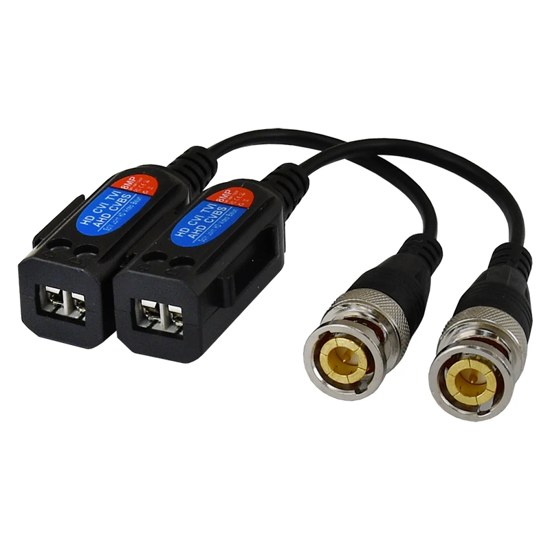 PULSAR csavartérpáras adó szett (a szett 2 átalakítóból áll), lengő BNC csatlakozóval. Alkalmazás: csavartérpáras videójel továbbítás (impedancia illesztés). Videójel: 1,0Vp-p, 75Ohm. Videó jeltovábbítási távolság:400 m – HDCVI. 200 m – HDTVI. 320 m – AHD. 400 m – CVBS. Operation of cameras up to 8 Mpx. Koaxvezeték impedanciája / csatlakozó típus: 75Ohm / BNC dugó. Csavartérpáras oldali impedancia / csatlakozó típusa: 100Ohm / sorkapocs. Csillapítás: - 0,5dB / 5MHz. Méret: Szé=15 Ma=15 Mé=47 mm (vezeték – 155 mm hosszú).