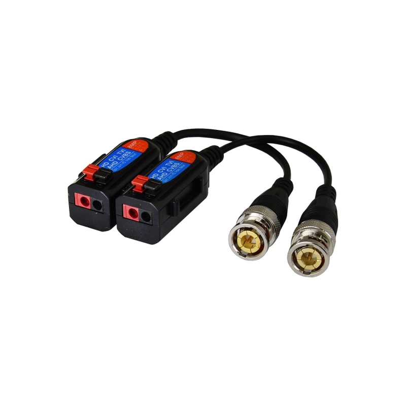 PULSAR csavartérpáras adó szett (a szett 2 átalakítóból áll), lengő BNC csatlakozóval (klipszes UTP csatlakozó). Alkalmazás: csavartérpáras videójel továbbítás (impedancia illesztés). Videójel: 1,0Vp-p, 75Ohm. Videó jeltovábbítási távolság:450 m – HDCVI. 230 m – HDTVI. 320 m – AHD. 450 m – CVBS. Operation of cameras up to 8Mpx. Koaxvezeték impedanciája / csatlakozó típus: 75Ohm / BNC dugó. Csavartérpáras oldali impedancia / csatlakozó típusa: 100Ohm / sorkapocs. Csillapítás: - 0,5dB / 5MHz. Méret: Szé=15 Ma=15 Mé=47 mm (vezeték – 155mm hosszú). Az adók csatlakoztatásának lehetősége (gyors kattintás típusú kapcsolat).