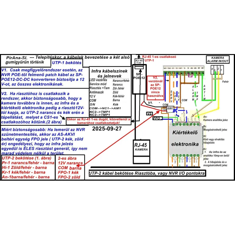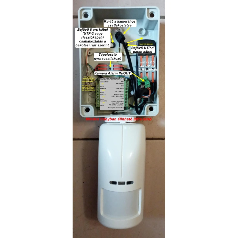 - Egyszerű kétkábeles telepítés: UTP + 8 eres alarm kábel