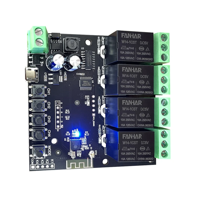 - 4 relé csatorna: Mindegyik csatorna maximum 10A/250V terhelhetőséggel rendelkezik, így képes nagyobb teljesítményű eszközök vezérlésére is.