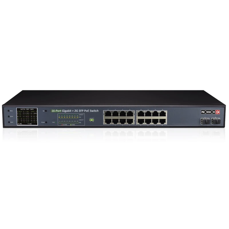 A PROVISION-ISR 16+2 portos PoE switch egy ipari kategóriás, nem menedzselhető hálózati eszköz, amelyet kifejezetten IP-alapú megfigyelőrendszerekhez és más PoE-t igénylő alkalmazásokhoz terveztek. A készülék 16 darab IEEE 802.3af/at kompatibilis PoE porttal és 2 darab 1 Gbps SFP optikai uplink porttal rendelkezik. A beépített túlfeszültség-védelem, a CCTV mód és a VLAN funkciók révén a switch ideális választás professzionális telepítésekhez, különösen ott, ahol hosszú kábelezési távolság és megbízható tápellátás szükséges.