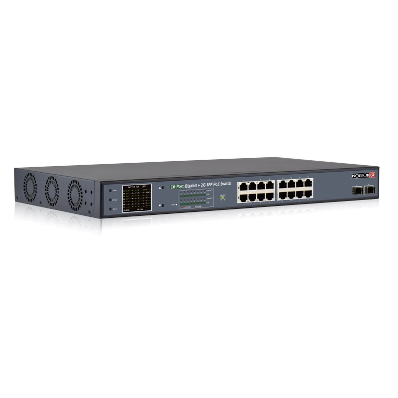 - Portkiosztás: 16 x 10/100/1000 Mbps RJ45 PoE port + 2 x 1 Gbps SFP port