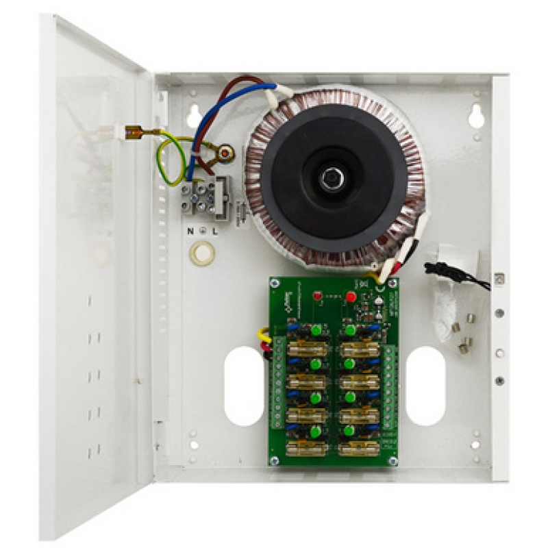 PULSAR CCTV tápegység 8 csatornás. 8x0.75A/24VAC (8x0.69A/27VAC), kimenet: 24VAC vagy 27VAC, 8x1A üveg biztosíték, méret: 210x242x62+8