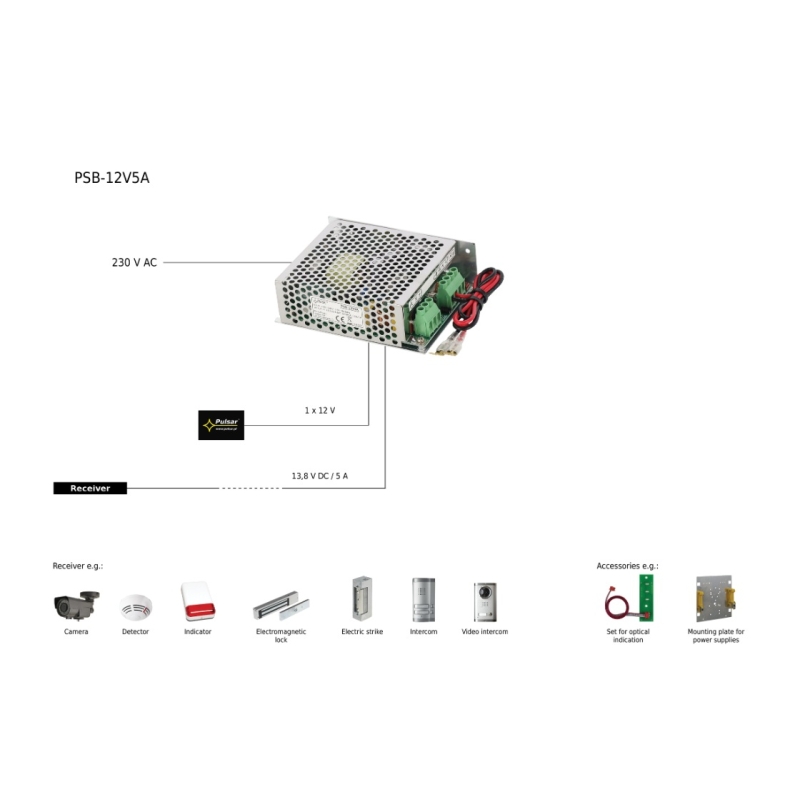 A PULSAR PSB 13,8V / 5A egy professzionális, zárt kivitelű, kapcsoló üzemmódú tápegység, amelyet kifejezetten biztonságtechnikai és ipari alkalmazásokhoz terveztek. A készülék megbízható energiaellátást biztosít olyan rendszerek számára, ahol elengedhetetlen a stabil feszültség és a folyamatos működés, például riasztóberendezések, CCTV rendszerek, beléptető rendszerek vagy más elektronikus eszközök esetében.