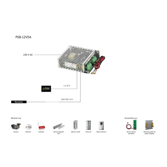 PULSAR PSB 13,8V / 5A zárt puffer kapcsoló üzemmódú tápegység, Tápegység: 200 ÷ 240VAC, Tápegység kimenet: 5A / 13,8VDC, 129 x 40 x 98 [+/- 2 mm]