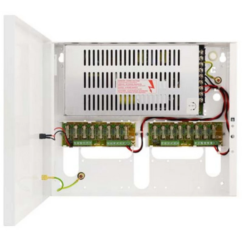 PULSAR CCTV tápegység, 16 csatornás. Tápfeszültség: 176÷264VAC, Tápfeszültség kimenet:16 x 1A/12VDC, Feszültség beállítási tartomány: 12÷15Vdc, Hatásfok: 85%, Mérete:290 x 256 x 52 [+/-2 mm] . Padlótól való távolság: 8mm. Védelem: SCP, OLP, OVP*, túlfeszültség elleni védelem. . Telepítési hely: Felületre szerelhető, Kijelzés: LED, Anyaga: DC01-es fémlemez, 0.7mm RAL9003 (fehér) fém. IP védettség: IP20. Lengyel.