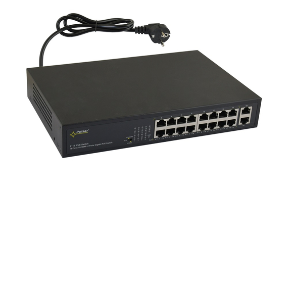 A PULSAR S116 egy ipari minőségű, 16 portos PoE switch, amelyet kifejezetten olyan professzionális felhasználásra terveztek, ahol megbízható tápellátásra és stabil adatkapcsolatra van szükség IP alapú eszközök számára. A berendezés teljes mértékben megfelel az IEEE 802.3af/at (PoE/PoE+) szabványoknak, így ideális választás IP kamerák, vezeték nélküli hozzáférési pontok, VoIP telefonok, valamint egyéb PoE-kompatibilis hálózati eszközök üzemeltetéséhez.