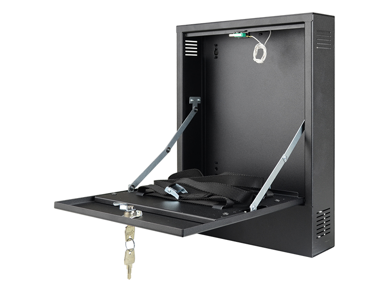 PULSAR kisméretű szabotázsvédett fém doboz, videorögzítők illetéktelen hozzáférés elleni mechanikus védelme, függőleges falra történő felszerelés, vízszintesen lenyitható előlap, fokozatmentesen állítható rögzítőszíj, kettős - kinyitás és falról történő eltávolítás elleni - szabotázsvédelem, mechnanikus zár, 1 mm vastagságú acéllemez ház, méret külső/belső 320x430x82+14 / 260x250x62 mm, beltéri alkalmazás, fekete szín, működési hőmérséklet -10°C~+40°C