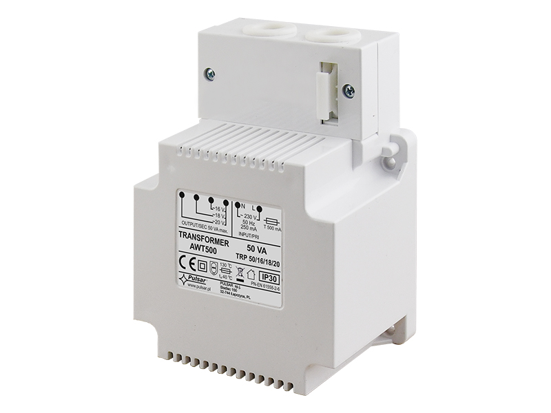 PULSAR Transzformátor TRP 50VA/16V/18V/20V. Teljesítmény: 50VA, Tápfeszültség: 230V/50Hz/0,25A Kimeneti feszültség: 16V/3A és 18V/2,8A és 20V/2,5A, Hőbiztosíték 130°C, Tokozás: PC/ABS V-O, IP30, DIN sínes rögzítéshez AWO467 konzol szükséges