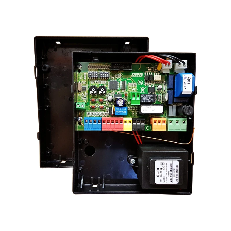 PROTECO Vezérlés, egymotoros, 230V-os, tolókapuhoz, LED-es, automatikus vagy lépésről-lépésre programozás, lassítás, társasház-, gyorsvisszazárás- és akadályérzékelés funkciók, gyalogos és vészleállító bemenetek, mechanikus / mágneses végállás kapcsoló bemenet, nyitási és zárási infrasorompó bemenetek, biztonsági szegély csatlakozó, opcionális kiegészítő rádiócsatorna, beépített rádióvevő 433,92 MHz (32 kód) használható fix vagy ugrókódos, automatikus hibadiagnosztika, tápfeszültség 230 Vac / 50-60Hz, motorkimenet 230 Vac / max. teljesítmény 600 W, villogó kimenet 24 Vac / max. 20 W, jelzőlámpa/kertvilágítás vezérlés, kiegészítő tápellátás 24 Vdc / max. 5 W, méret (áramkör) 137x84x37mm, működési hőmérséklet: -20°C~+50 °C, IP55, olasz, 2 év garancia