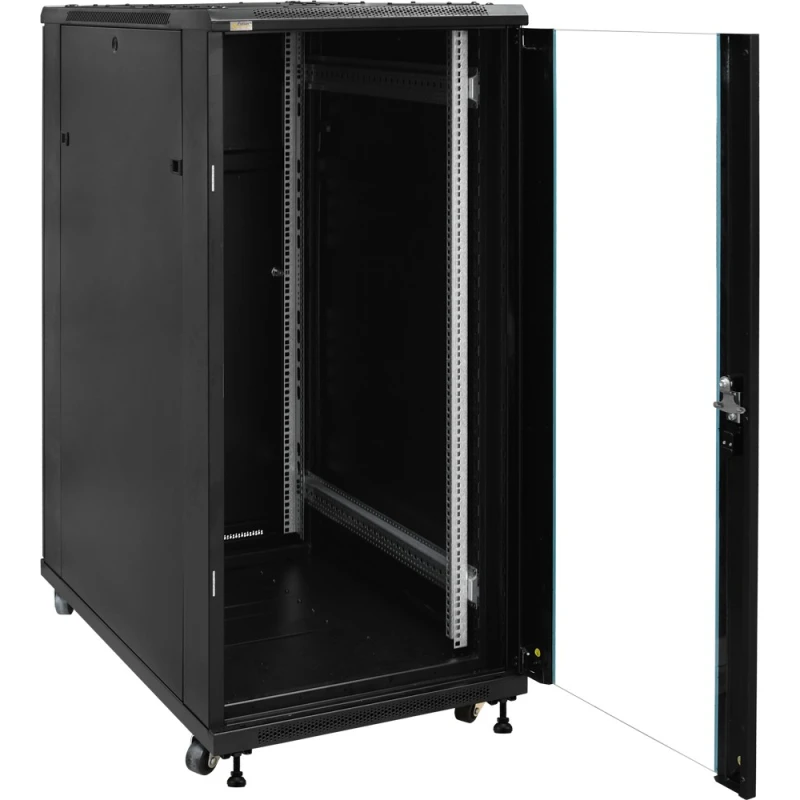 PULSAR RACK szekrény 27U, álló kivitel, lapraszerelt 600x1000. Javasolt felhasználás: A RACK 19" szekrény kiválóan használható CCTV, Beléptető, RTV, LAN vagy közepes/nagy cégek IT rendszereihez. 19" normál méretezésű szekrény, amelynek célja a beépített eszközök mechnaikus védelmének ellátása valamint ezek esztétikus szerelése. Méret:- rögzítés: Szé=19", Ma=27U, Mé=760mm. - külső: Szé=600, Ma=1388, Mé=1000 [mm, +/-2]. Anyagok:- hidegen hengerelt acél SPCC 1,2mm, 1,5mm, 2mm – RAL 9004. Terhelhetőség: 1000kg. Megjegyzés:- tartozék: 4db nem rögzíthető görgő, 4db szintező láb. - zárható elsőajtó (2 kulcs tartozék). - zárható hátsóajtó (2 kulcs tartozék). - lapraszerelt