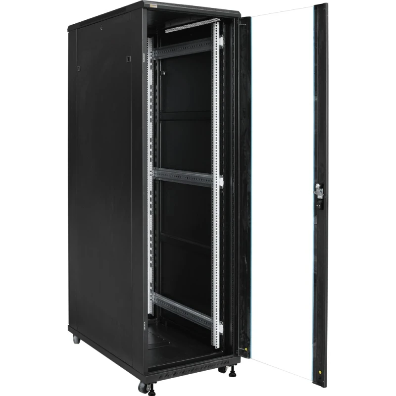 PULSAR RACK szekrény, álló kivitel, lapra szerelt 42U/600x1000. Javasolt felhasználás: A RACK 19” szekrény kiválóan használható CCTV, Beléptető, RTV, LAN vagy közepes/nagy cégek IT rendszereihez. 19” normál méretezésű szekrény, amelynek célja a beépített eszközök mechnaikus védelmének ellátása valamint ezek esztétikus szerelése. Méret:- rögzítés: Szé=19”, Ma=42U. - külső: Szé=600, Ma=2055, Mé=1000 [mm, +/-2]. Anyagok:- hidegen hengerelt acél SPCC 1,2mm, 1,5mm, 2mm - RAL 9004. Terhelhetőség: 800kg. Megjegyzés:- tartozék: 4db nem rögzíthető görgő, 4db szintező láb. - zárható elsőajtó (2 kulcs tartozék). - zárható hátsóajtó (2 kulcs tartozék). - lapraszerelt