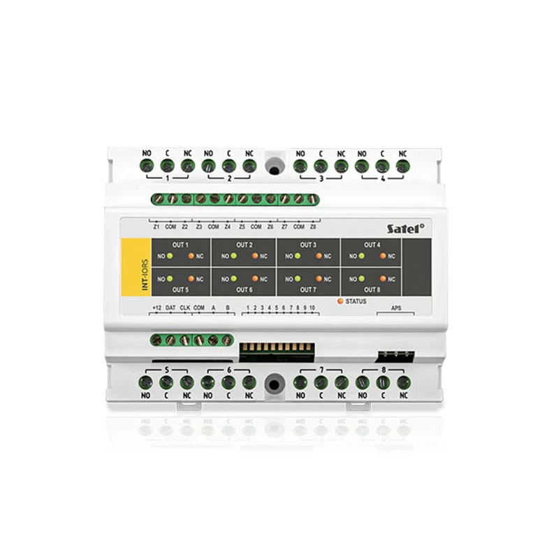 A SATEL INT-ORS egy ipari kivitelű, DIN-sínre szerelhető ki- és bemeneti bővítőmodul, amely kompatibilis az INTEGRA és CA-64P sorozatú riasztóközpontokkal. A modul célja a rendszer funkcionalitásának bővítése, lehetővé téve különféle külső eszközök vezérlését és állapotuk visszajelzését. A készülék 8 darab programozható bemenettel és 8 darab nagyáramú relés kimenettel rendelkezik, melyek akár 250 VAC / 16 A terhelés kapcsolására is alkalmasak. A modul beépített LED visszajelzőkkel van ellátva a bemenetek és kimenetek állapotának vizuális ellenőrzéséhez.