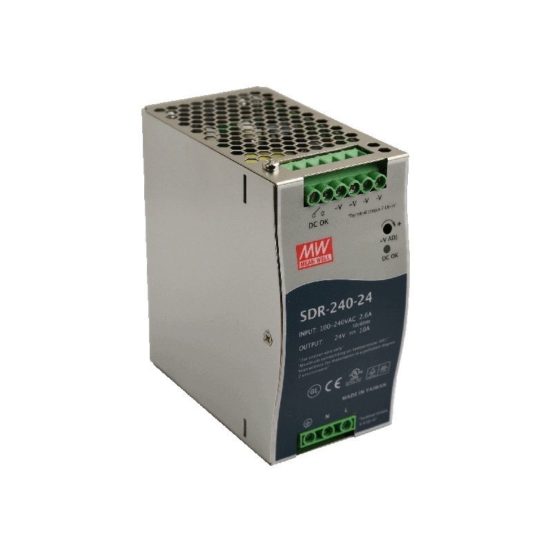 A DIN sínre szerelhető tápegység ipari és automatizálási alkalmazásokhoz lett tervezve, ahol megbízható, stabil és hatékony egyenfeszültség-ellátás szükséges. A készülék univerzális bemeneti feszültségtartománnyal rendelkezik, így alkalmas mind váltakozó (AC), mind egyenáramú (DC) hálózatokhoz való csatlakoztatásra. A kimeneti feszültség 24VDC, maximális kimeneti áramerőssége 10A, amely ideálissá teszi különféle ipari vezérlő- és automatizálási rendszerek tápellátására.