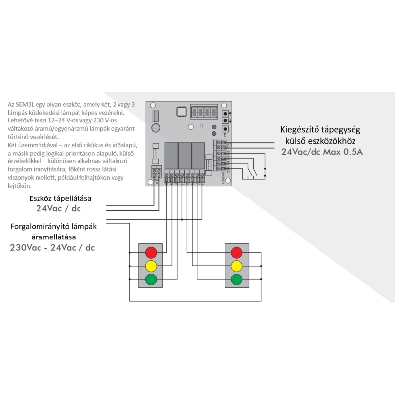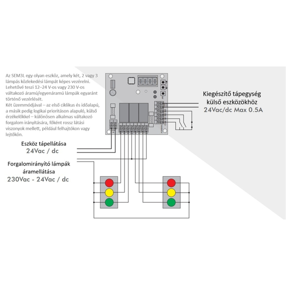 - Kompatibilitás: Két- és háromlámpás szemaforok vezérlésére alkalmas.