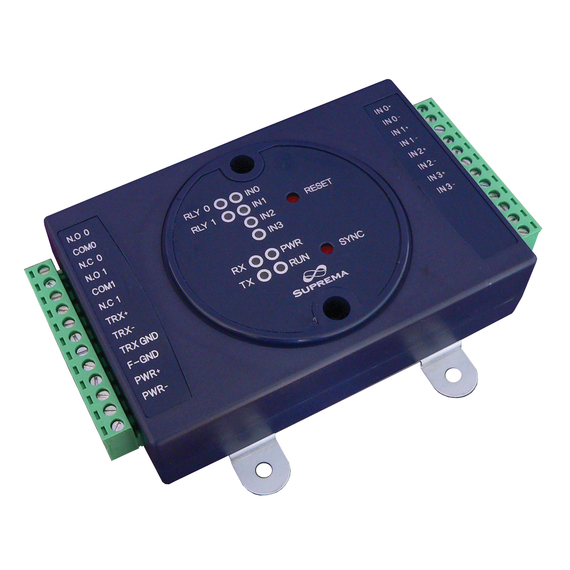 SUPREMA I/O modul BioEntry Plus-hoz és BioStation-höz, a BioStation-ben és BioEntry Plus-ban levő relé használata helyett biztonsági okokból, 4 digitális bemenet, 2 relé kimenet, titkosított kommunikáció az eszközökkel, méret 143x82x35 mm