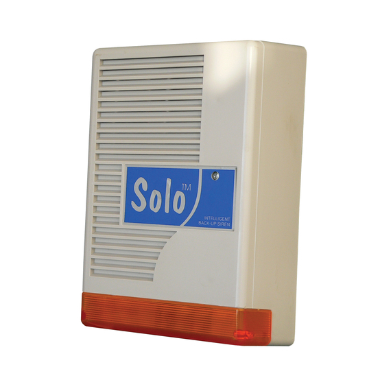 SOLO Sziréna és villogó, kültéri, nyomókamrás, mikroprocesszor vezérelt, szabotázs védett IP34 kettős burkolat (műanyag-acél), kiöntött, teljesen időjárásálló elektronika, negatív v. pozitív indítási lehetőség, lámpa villogtatás, szerviz bemenet, hiba kimenet, 3 perc riasztási idő. Alacsony nyugalmi áramfelvétel, 7Ah akkuhely, 118dB, 180x270x90, 2kg - Tetszetős kialakítású, a hozzá adott sablonnal könnyű szerelni. A tető oldalra nyílik!
