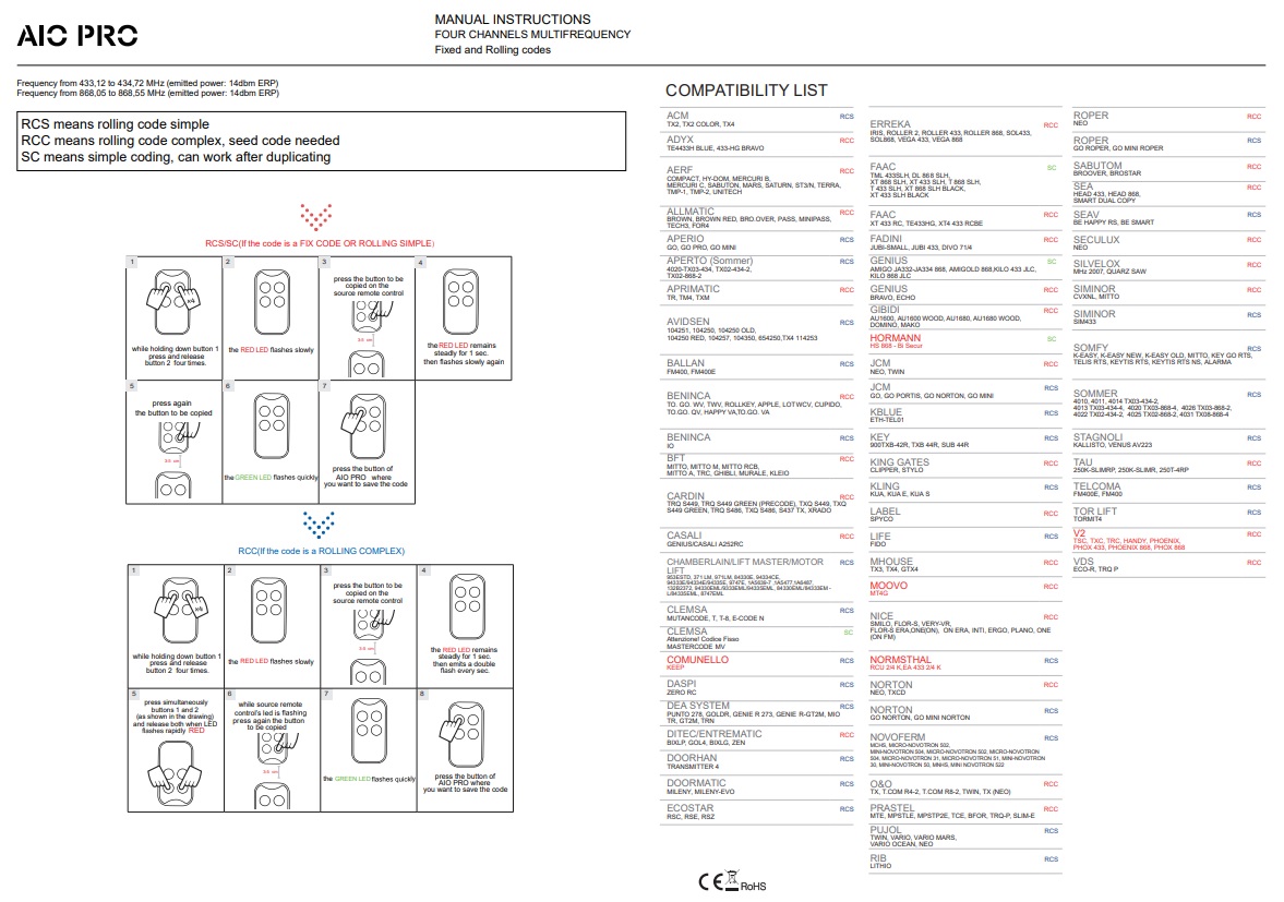 • Kompatibilitás: Támogatja a legtöbb elterjedt ugrókódos és fix kódos rendszert, FAAC, DITEC BENINCA, HÖRRMANN, BFT, SOMMER, CAME, LiftMaster, Somfy, V2, Nice egyes típusait. Így széles körben alkalmazható garázskapuk, sorompók, riasztók és egyéb rádiófrekvenciás vezérlőrendszerek esetén