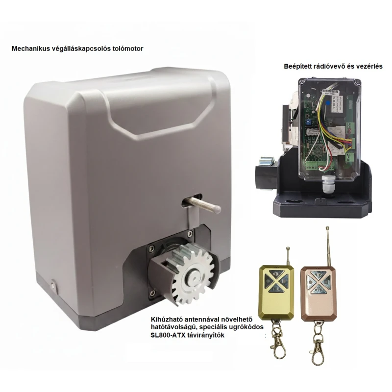 TIGERMAT TM-SL800 Kit_mech_ATX - automata tolókapu motor és vezérlés 2 db 433 MHz-es növelt biztonságú ugrókódos, kihúzató antennás nagy hatótávolságú távirányítóval, mechanikus végálláskapcsolóval, max. 800kg-os kapuhoz