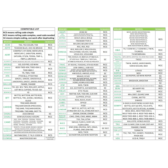 - Kódmásolási funkció: Rögzített kód, tanulási kód, 60 gördülő kód/márka