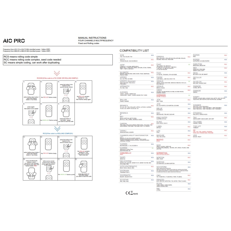 • Kompatibilitás: Támogatja a legtöbb elterjedt ugrókódos és fix kódos rendszert, FAAC, DITEC BENINCA, HÖRRMANN, BFT, SOMMER, CAME, LiftMaster, Somfy, V2, Nice egyes típusait. Így széles körben alkalmazható garázskapuk, sorompók, riasztók és egyéb rádiófrekvenciás vezérlőrendszerek esetén