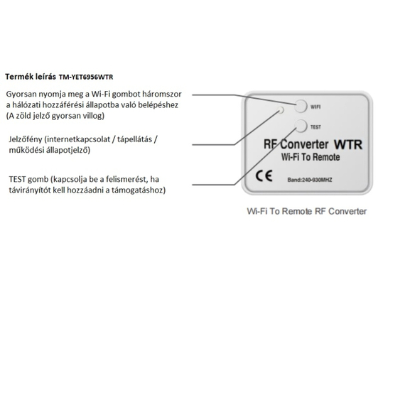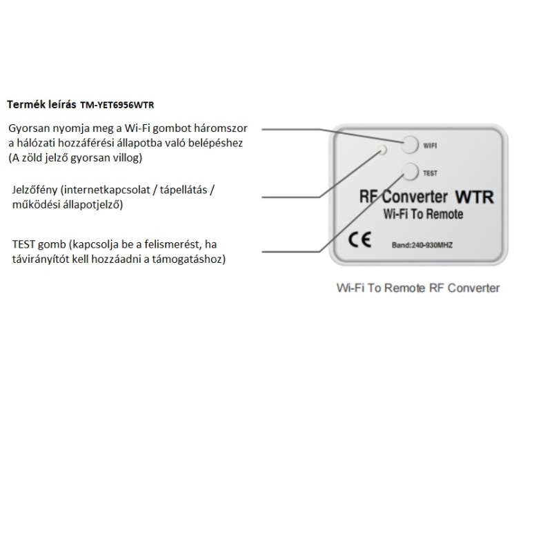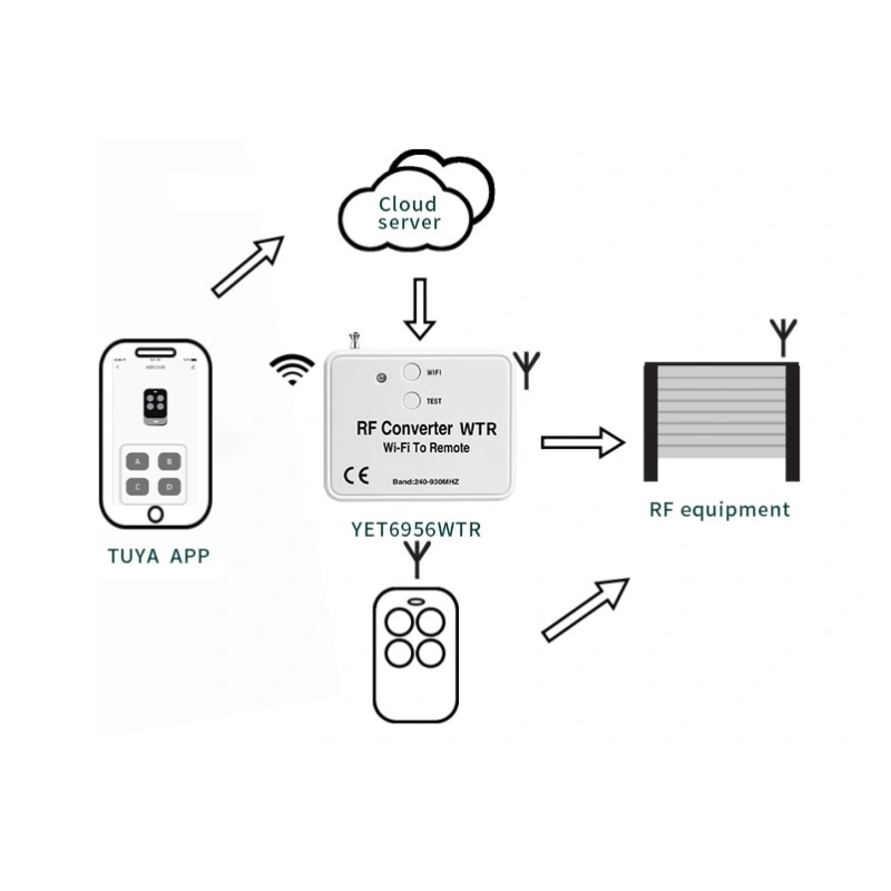 Megtanítható a több márkájú fix kódú és ugró kódú távirányító, és az eredeti távirányítót rátanítva a továbbiakban távirányítóként működik WiFi-n kereszül TUYA alkalmazással.