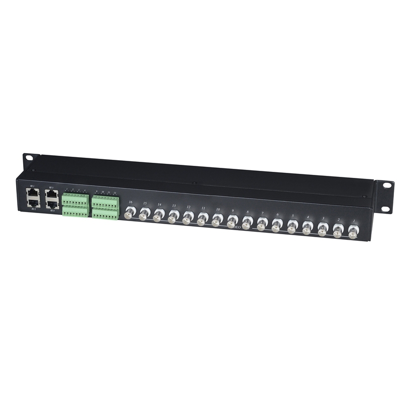 SC&,T Videojel átalakító (adó, vagy vevő), 16 csatornás mini passzív koax-UTP csavart érpáras analóg HD videojel (AHD/HD-CVI/HD-TVI) ,BNC, RJ45, valamint sorkapcsos csatlakozókkal, átviteli távolság: 300m (720P), 200m (1080P), 1U Rack kivitel