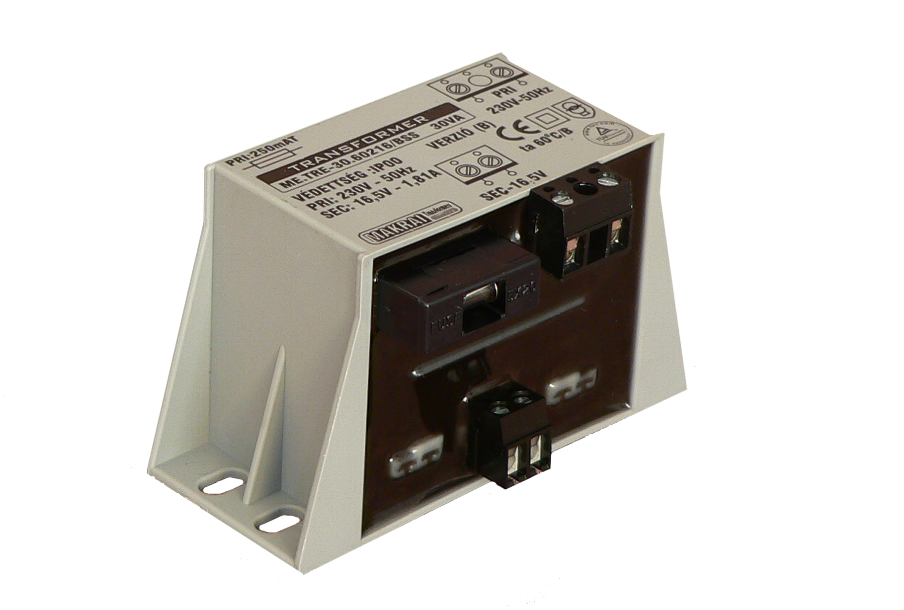 MAKRAI Transzformátor, osztott kamrás, műgyantával kiöntött, 230 / 16.5 Vac, szekunder áram 1.81 A, 30 VA, 250 mAT olvadóbiztosító, sorkapcsos csatlakozás max. (1.5 mm2), méret 88x54x52 mm