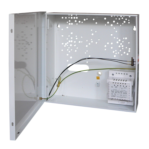 PULSAR Transzformátor szabotázsvédett fém dobozban, 280x290x80mm, tápegység: 40VA, 18V/2A, 16V/2.2A, ajtóföldelés, bekötőkábelek, 12V/7Ah akkuhely, SATEL, DSC, PARADOX, ROKONET, SUMMIT, CROW, PYRONIX és NAPCO előfuratok