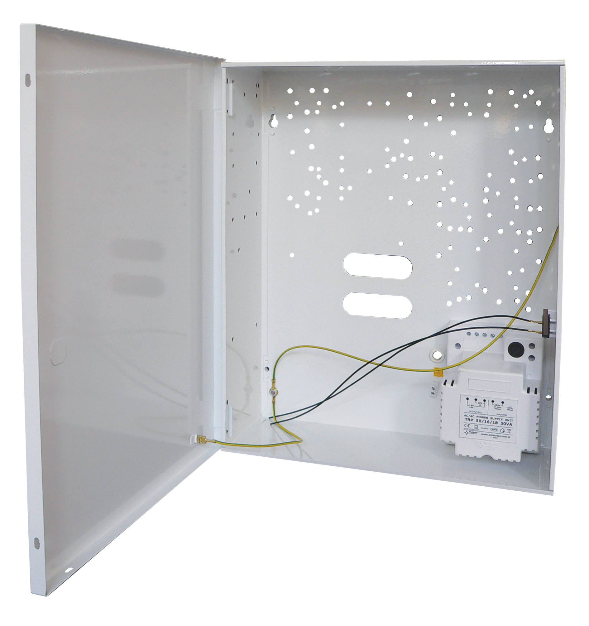 PULSAR Transzformátor szabotázsvédett fém dobozban. 50VA, 18V/2.7A, 16V/3A, 320x395x120mm.