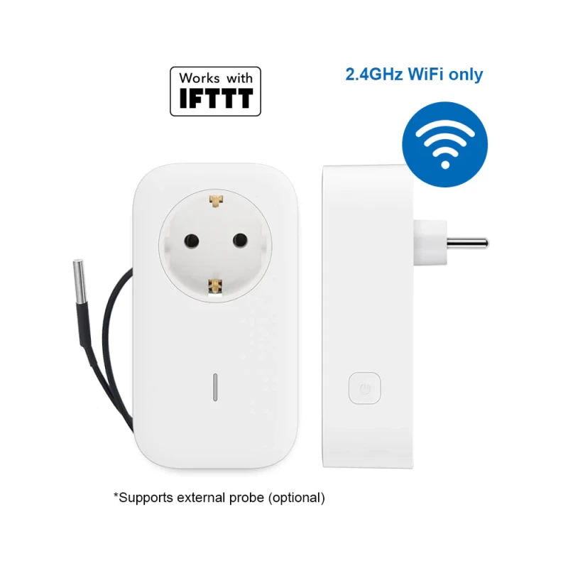- Külső érzékelők támogatása: A Smart Plug képes külső szondák (pl. hőmérséklet, páratartalom) csatlakoztatására, így környezeti adatok alapján is képes működni.