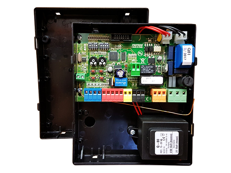 PROTECO Vezérlés, egymotoros, 230V-os, tolókapuhoz, LED-es, automatikus vagy lépésről-lépésre programozás, lassítás, társasház-, gyorsvisszazárás- és akadályérzékelés funkciók, gyalogos és vészleállító bemenetek, mechanikus / mágneses végállás kapcsoló bemenet, nyitási és zárási infrasorompó bemenetek, biztonsági szegély csatlakozó, opcionális kiegészítő rádiócsatorna, beépített rádióvevő 433,92 MHz (32 kód) használható fix vagy ugrókódos, automatikus hibadiagnosztika, tápfeszültség 230 Vac / 50-60Hz, motorkimenet 230 Vac / max. teljesítmény 600 W, villogó kimenet 24 Vac / max. 20 W, jelzőlámpa/kertvilágítás vezérlés, kiegészítő tápellátás 24 Vdc / max. 5 W, méret (áramkör) 137x84x37mm, működési hőmérséklet: -20°C~+50 °C, IP55, olasz, 2 év garancia